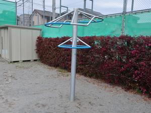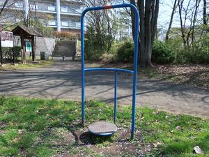 この2つの遊具のメーカーは分からないが、いくつか遊具があって、そのうち1つに「タカオ」のラベルがあるので、タカオか。 → その後、「懸垂トレーナー」、「ボディツイスト」と判明。
