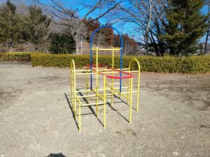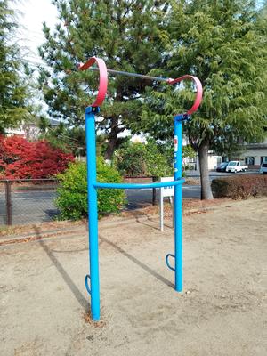 参考 - こども複合遊具の一部 (195, 狭くて懸垂はやりづらい。赤い部分は平行棒として使えそう。写真は問い合わせフォームでいただいたもの。2024.02.13)