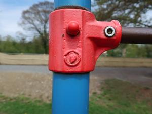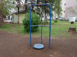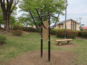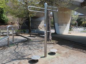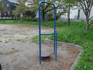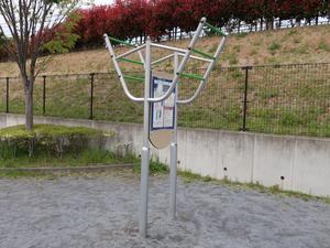 この2つの遊具のメーカーは分からないが、いくつか遊具があって、そのうち1つに「タカオ」のラベルがあるので、タカオか。 → その後、「懸垂トレーナー」、「ボディツイスト」と判明。
